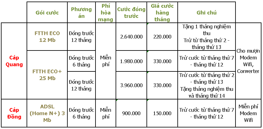 Nhằm tri ân khách hàng cũ và gia tăng ưu đãi cho khách hàng mới, trong tháng 12 năm 2014, Tập đoàn Viettel ra mắt nhiều gói cước khuyến mãi hấp dẫn. Đem lại cho khách hàng nhiều sự lựa chọn tốt hơn, nhanh hơn, rẻ hơn. Quý khách sẽ được tư vấn lựa chọn gói cước phù hợp, miễn phí hoàn toàn phí lắp đặt , tặng kèm modem wifi cao cấp. Đồng thời giảm cước hàng tháng chỉ còn 150.000đ/tháng (đối với gói home N+ 3 Mbps),…