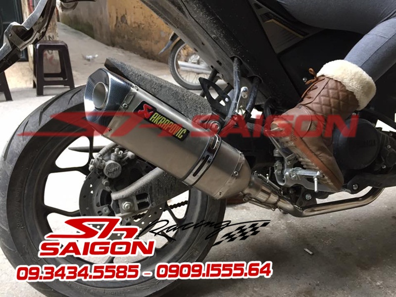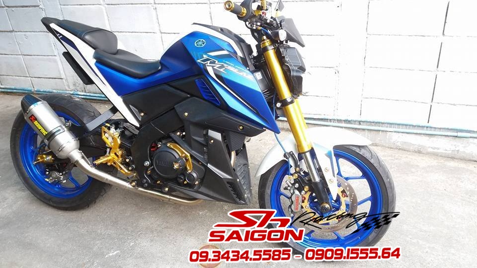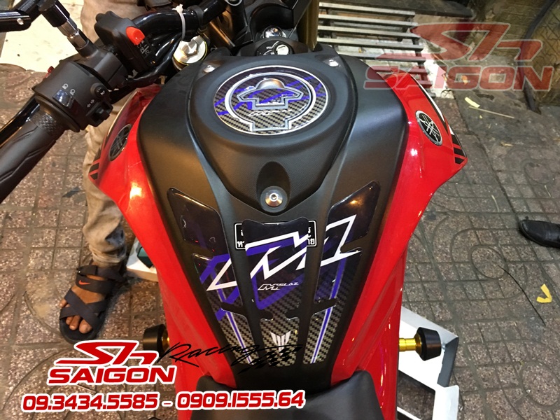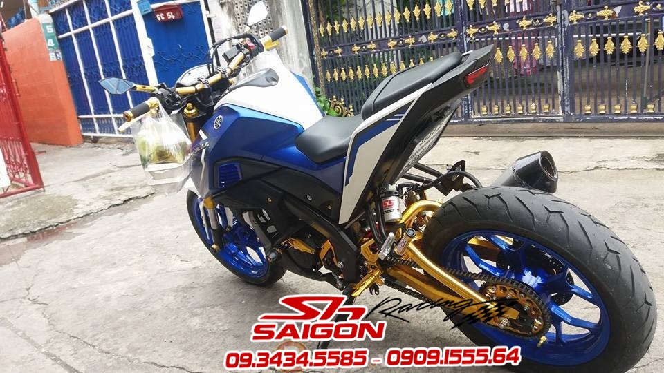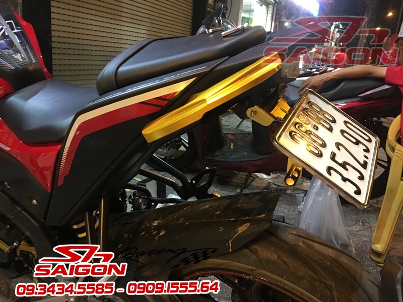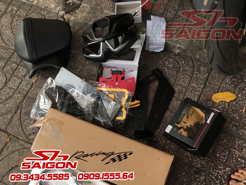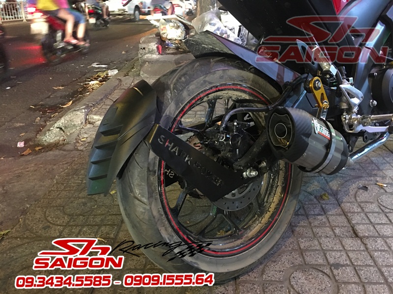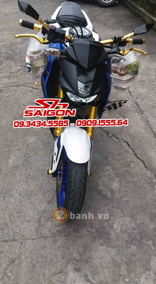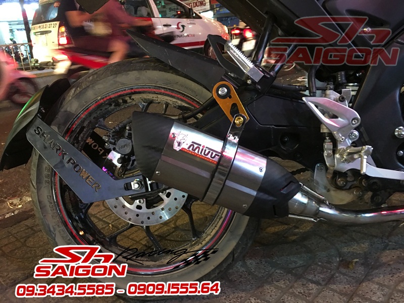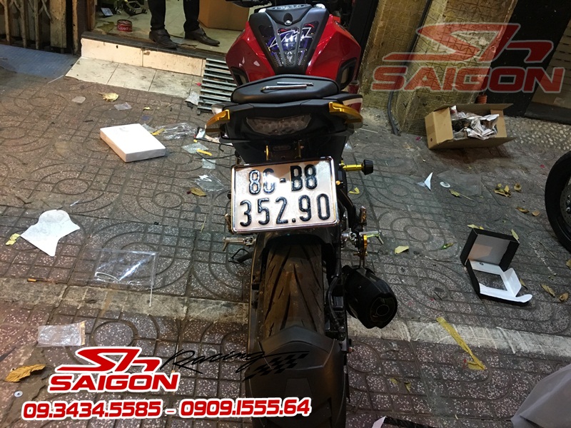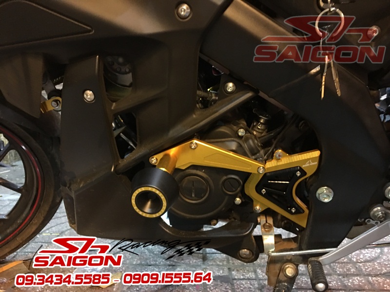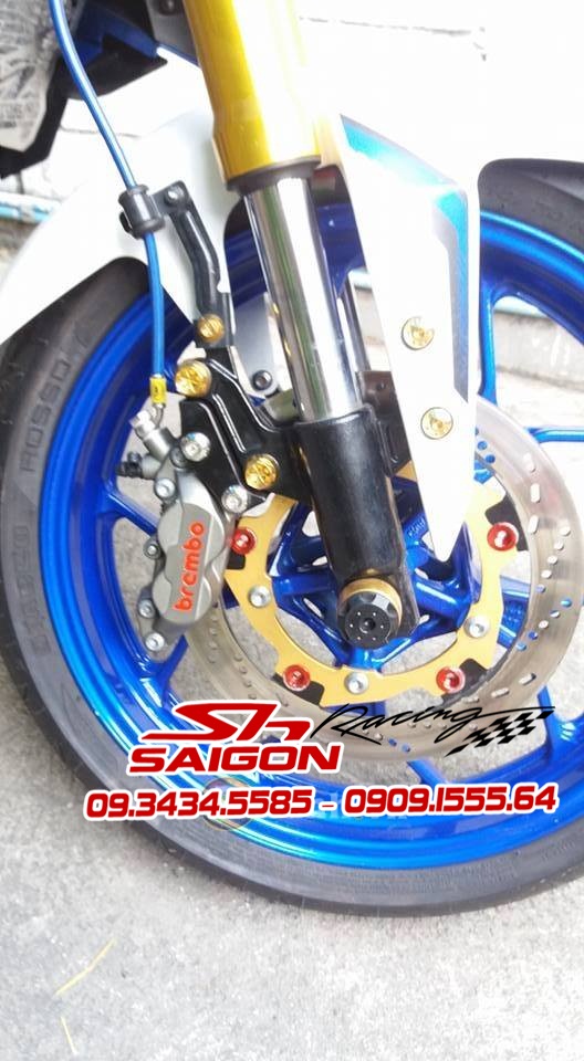 Cặp mâm được sơn màu xanh cùng tông xe,dĩa trước được thay bằng dĩa Brembo,gắn chống đổ lốc máy,che két nước,số gãy cnc và pô Akrapovic